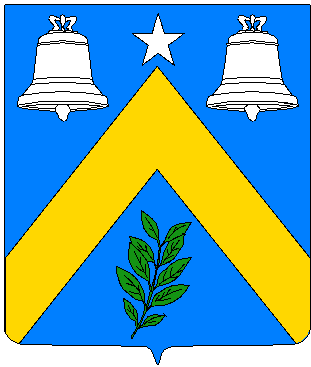 d az au chevron d or surmonté d une étoile d argt acc en chef de 2 cloches du mesme et en pointe d une branche de laurier au naturel