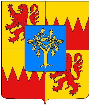 écartelé aux 1 et 4 d or au lion de gu aux 2 et 3 de gu à l emmanché d'or de 4 pièces mouvante du chef sur le tout d az au chêne d or à 4 branches passées en sautoir et 3 racines - commencer par l'emmanché