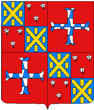 ecartelé en 1 et 4 contre écartelé d az au sautoir alésé d or cantonné de 4 billettes du mesme et de gu à trois fleurs d aubépine d argt posées 2 et 1 aux 2 et 3 de gu à la croix ancrée de vair