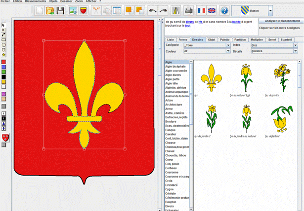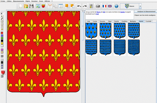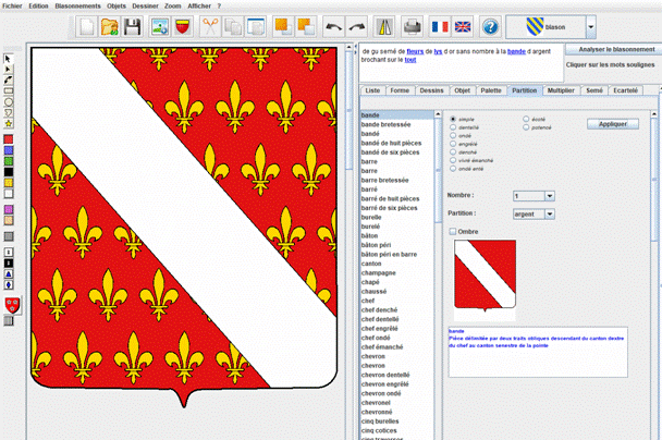 « de gueules semé de fleurs de lys d'or sans nombre à la bande d'argent brochant sur le tout »