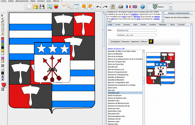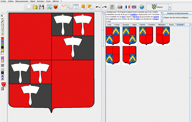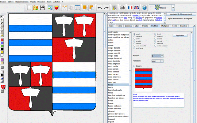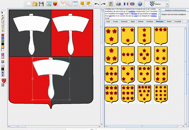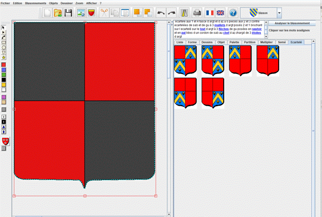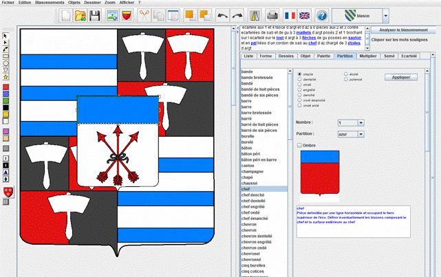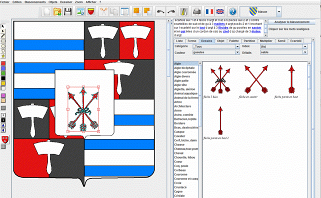 Clic sur le mot « flèche » dans le blasonnement, changer la couleur du meuble en gueules et la couleur du détail en sable avant de le poser sur le blason