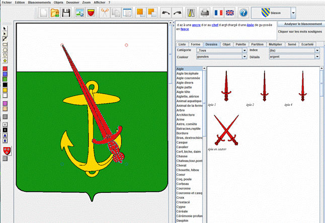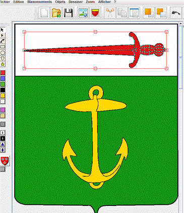 « d'azur à une ancre d'or au chef d'argent chargé d'une épée de gueules posée en fasce »