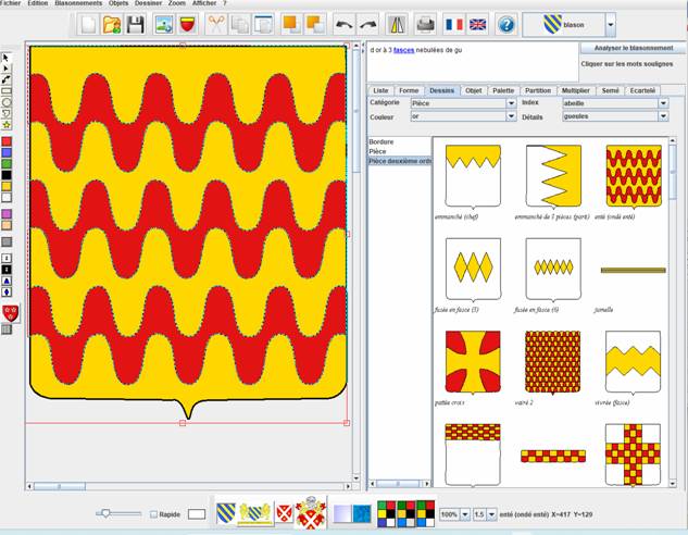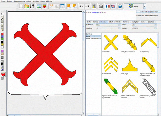 Pour les mots « échiqueté », « vairé », « emmanché », ouvrir l’onglet « Dessins » puis la rubrique « Pièce », puis « Pièce » ou « Pièce de second ordre »