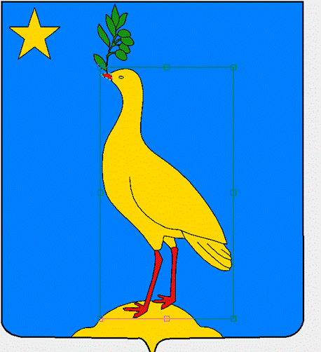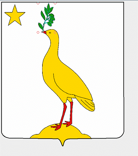 « d'azur à une outarde d'argent becquée, membrée, allumée de gueules tenant en son bec un rameau d'olivier de sinople, posée sur un tertre de même, accompagnée au canton dextre du chef d'une étoile d’or . »